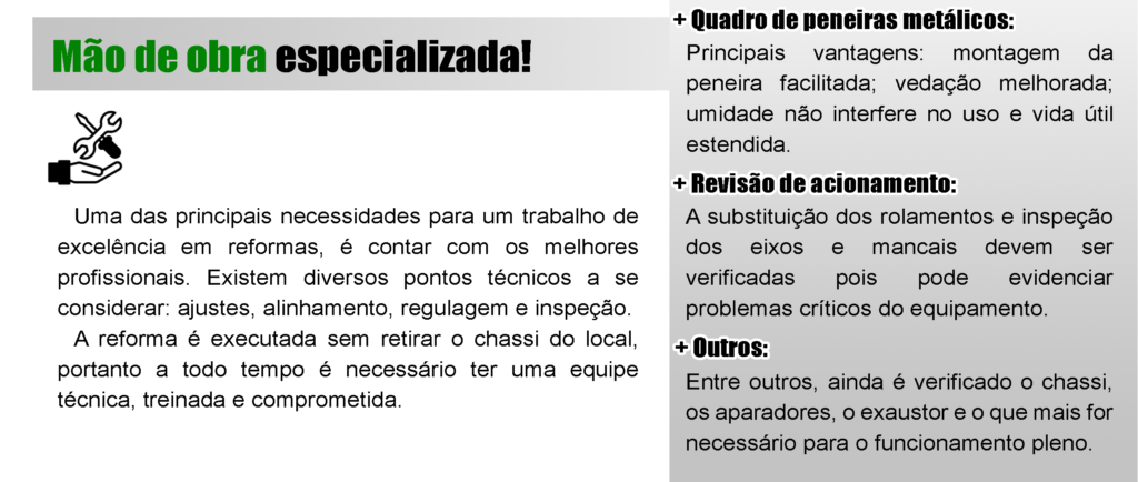 A consistência desse trabalho é a substituição das principais partes da máquina como: entrada bifurcada, caixa de aspiração, decks de peneiras, quadros de peneiras metálicos, eixo de acionamento completo, aparadores de impureza e de produto. Além da substituição, é realizada uma inspeção no chassi e caso seja necessário, são feitos reparos e reforços.